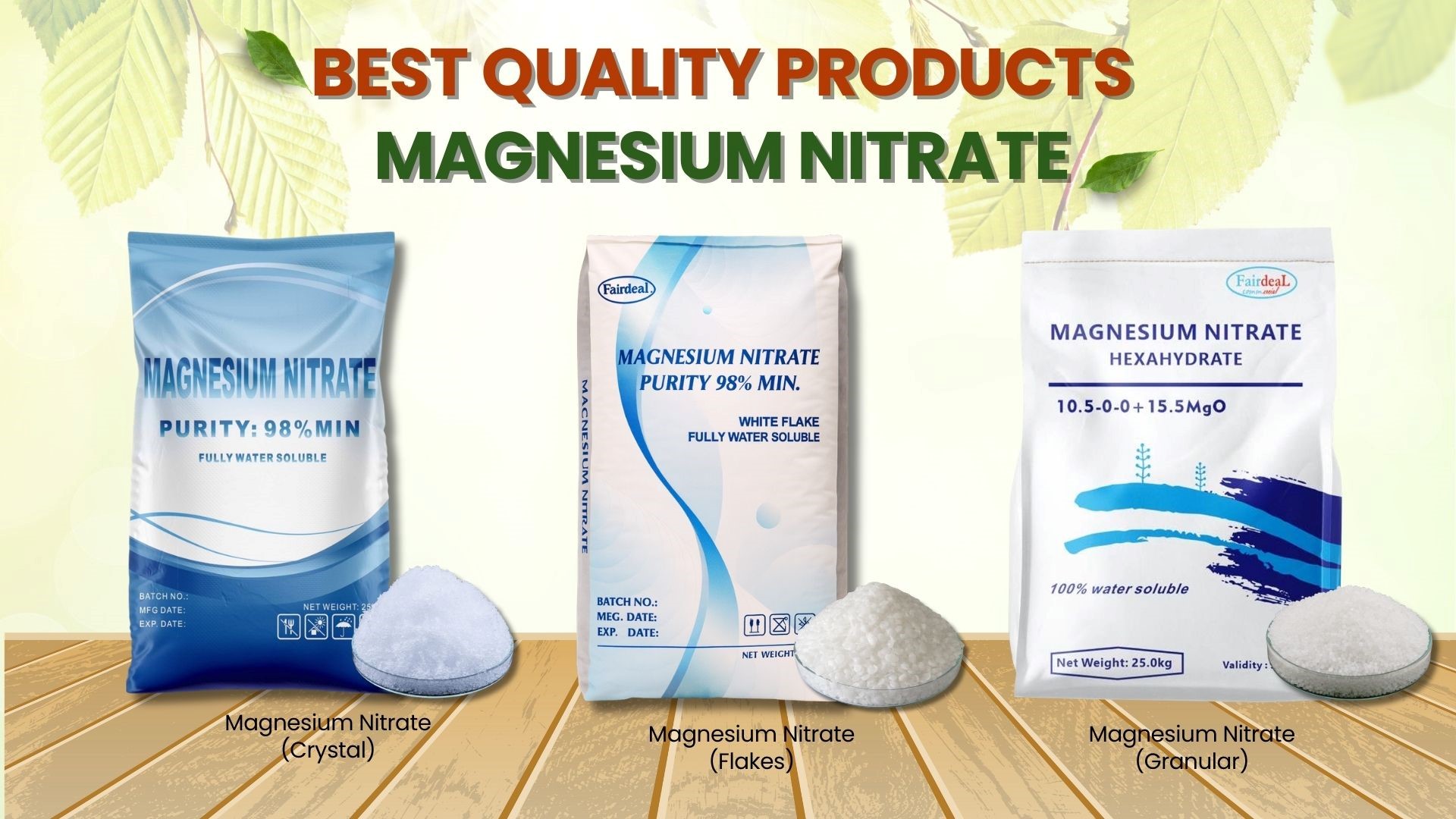 แมกนีเซียม ไนเตรท (Magnesium Nitrate) มีสูตรปุ๋ย NPK 10-0-0 โดยมีแมกนีเซียม 15-16% และไนโตรเจน ในรูปไนเตรท 10-11% ละลายน้ำง่าย พืชนำไปใช้ได้ในทันที เหมาะสำหรับไม้ผล ไม้ดอก พืชผัก พืชไร่ ทุกชนิด ซึ่งกว่าจะมาเป็น Magnesium Nitrate จะมีกระบวนการ โดยมีส่วนประกอบวัตถุดิบตั้งต้นดังนี้