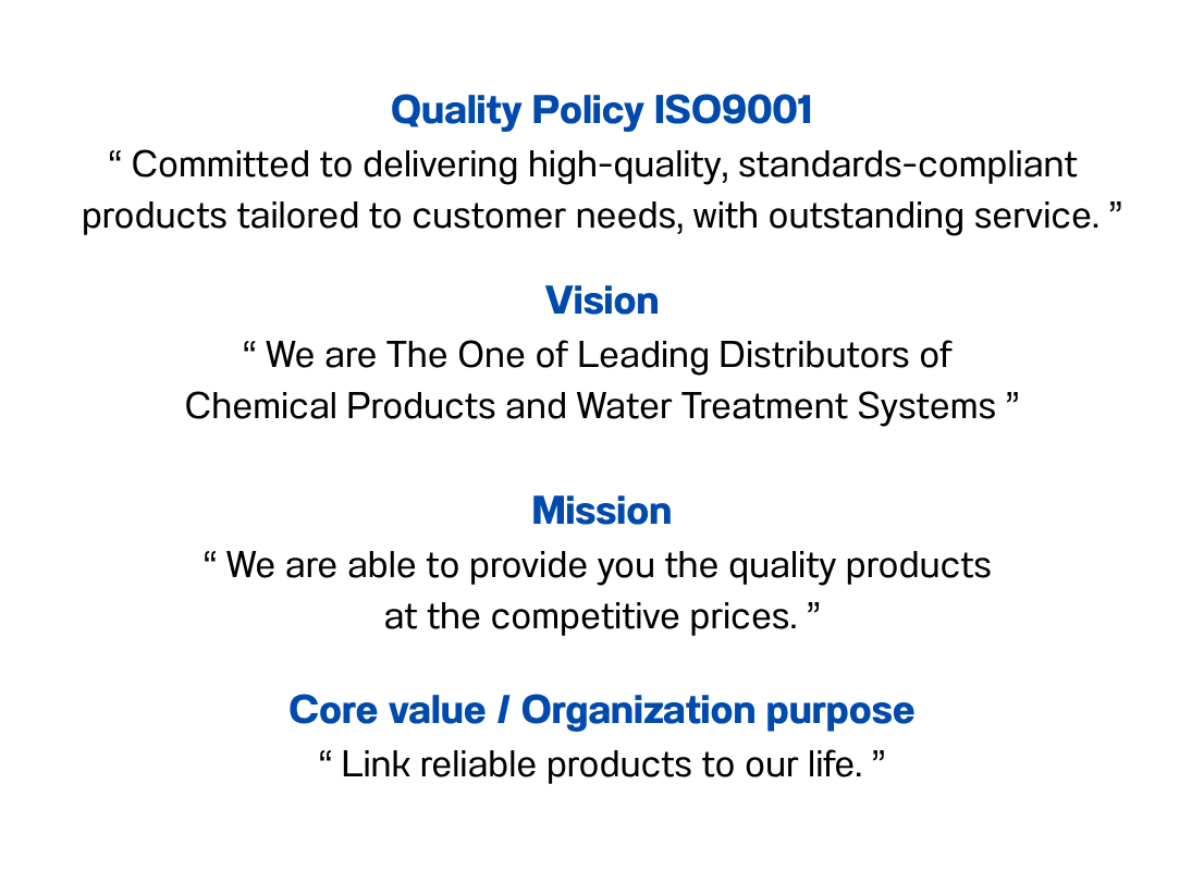 as an importer of high-quality chemicals and has been certified with ISO 9001:2015 standards, covering all industries. With over 20 years of experience, we are continuously determined to develop and source new products to meet our customers' needs. Additionally, we have strong partnerships with leading manufacturers and distributors both domestically and internationally. "