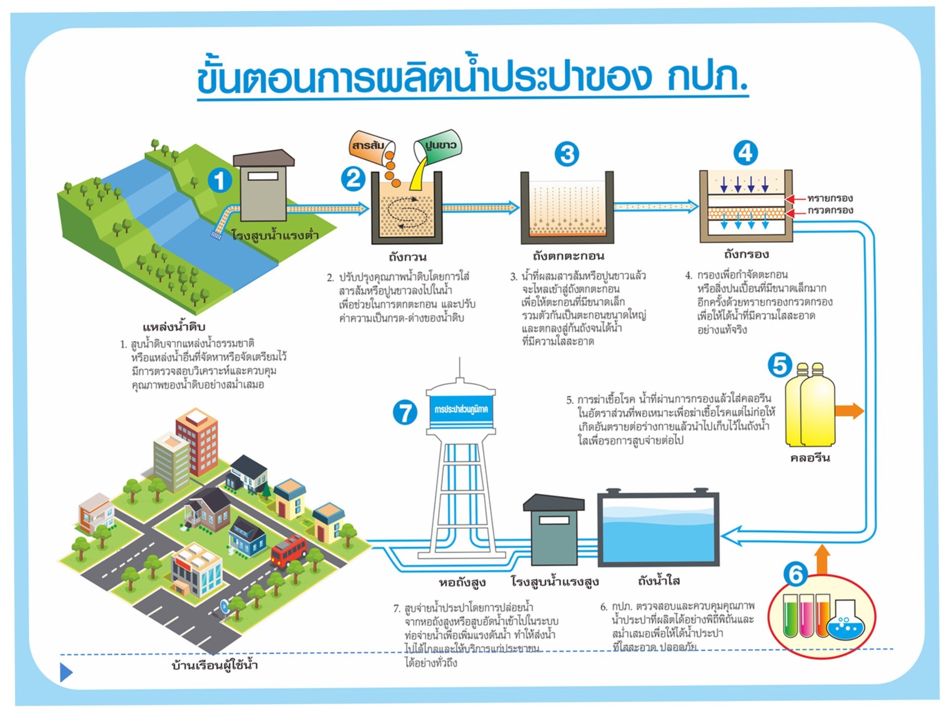 From the flowchart above, we can see the steps in the tap water production process, how many steps there are, and what happens in each one. In Step 2, PAC (also known as a coagulating agent) is added. This helps improve the quality of the water by enhancing the sedimentation process and adjusting the pH level of the raw water before it moves on to the next step.