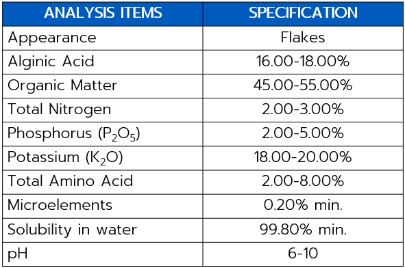 Appearance : Black brown flakes, soluble in water, extracted from marine seaweed.