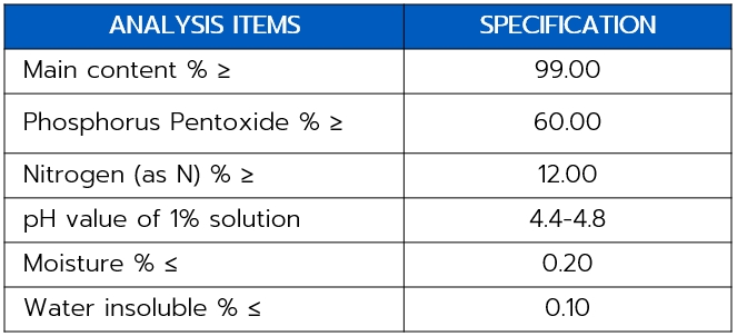 Used as a high effective non-chloride N, P compound fertilizer in agriculture. Its total nourishment (N+P2O5) is at 73%, and may be used as a basic raw material for N, P and K compound fertilizer.